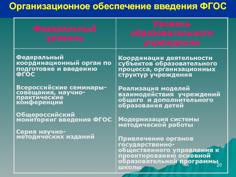 Слайд 20Организационное обеспечение введения ФГОС