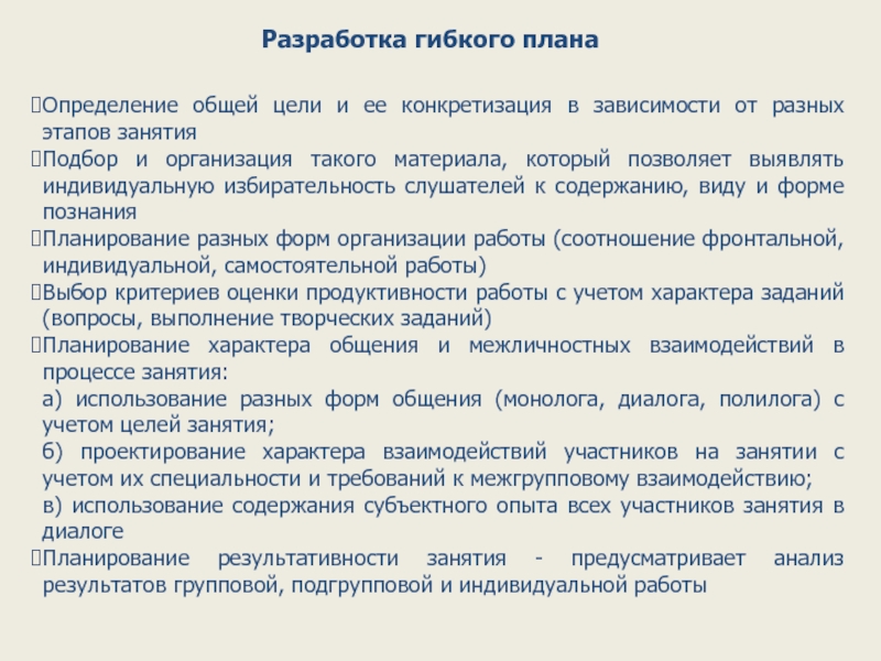 а) использование разных форм общения (монолога, диалога, полилога) с учетом целей занятия;