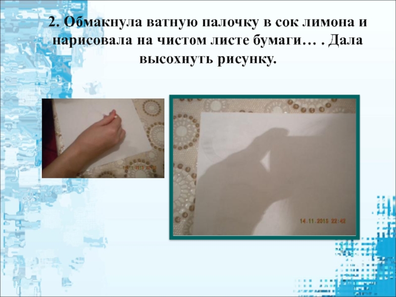 Слайд 52. Обмакнула ватную палочку в сок лимона и нарисовала на чистом