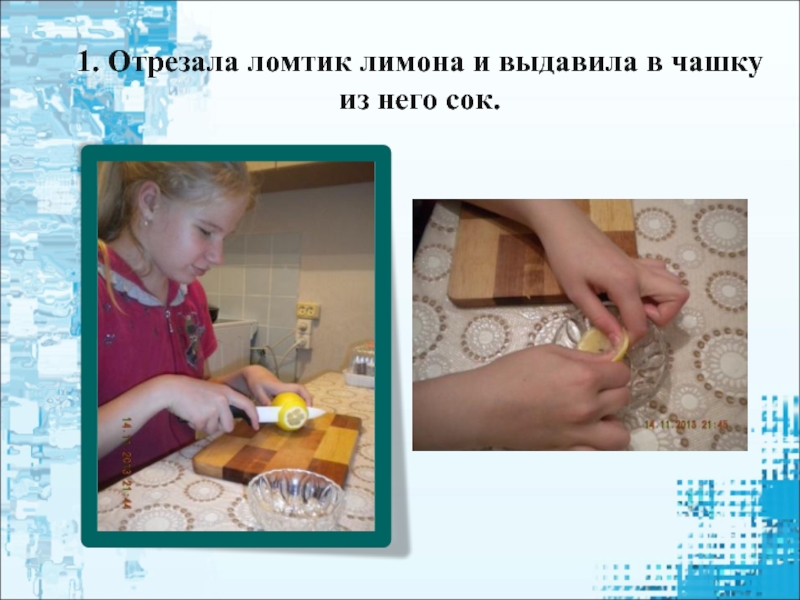 Слайд 41. Отрезала ломтик лимона и выдавила в чашку из него сок.