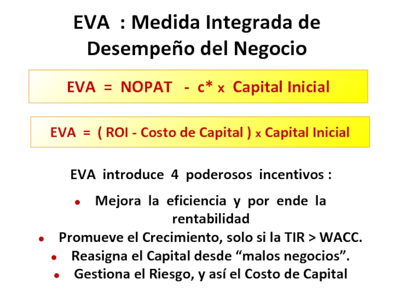 EVA = ( ROI - Costo de Capital ) x Capital Inicial