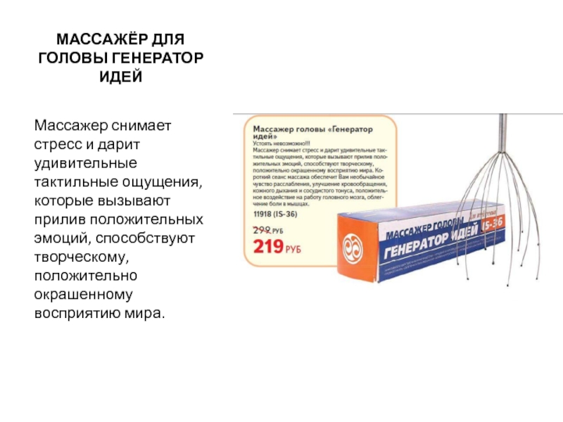 Слайд 34МАССАЖЁР ДЛЯ ГОЛОВЫ ГЕНЕРАТОР ИДЕЙ