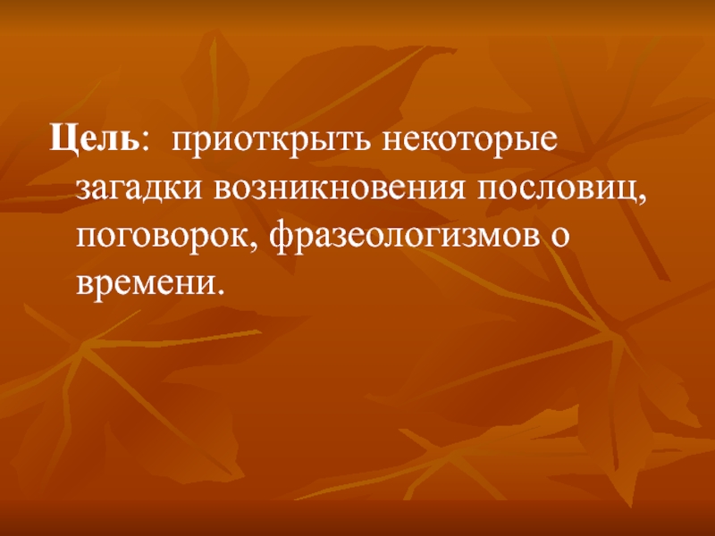 Цель: приоткрыть некоторые загадки возникновения пословиц, поговорок, фразеологизмов о времени.