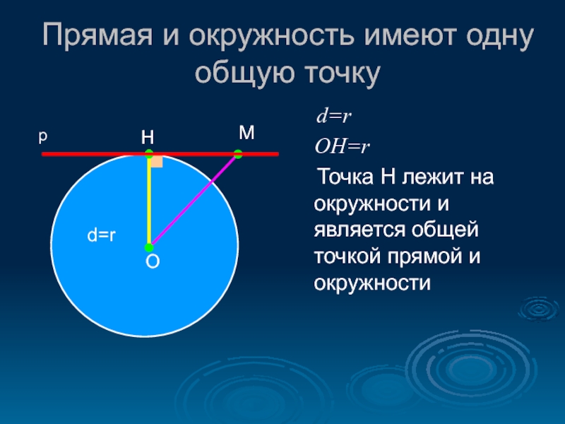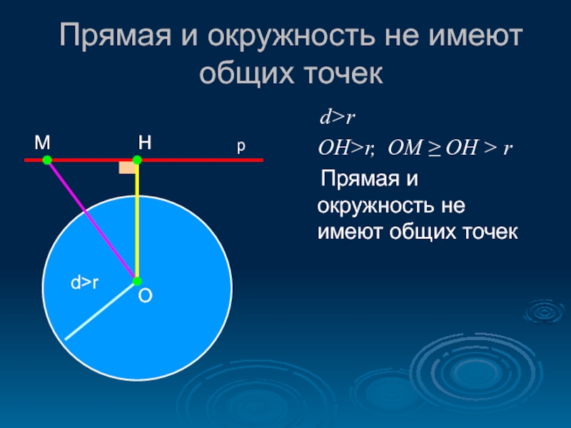 2. Так как перпендикуляр , проведенный из точки О к прямой р, меньше наклонной ОА, то расстояние от центра О окружности до прямой р меньше радиуса.
