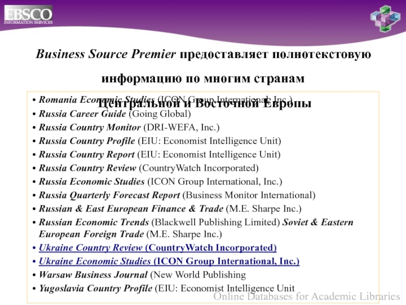 Business Source Premier предоставляет полнотекстовую информацию по многим странам