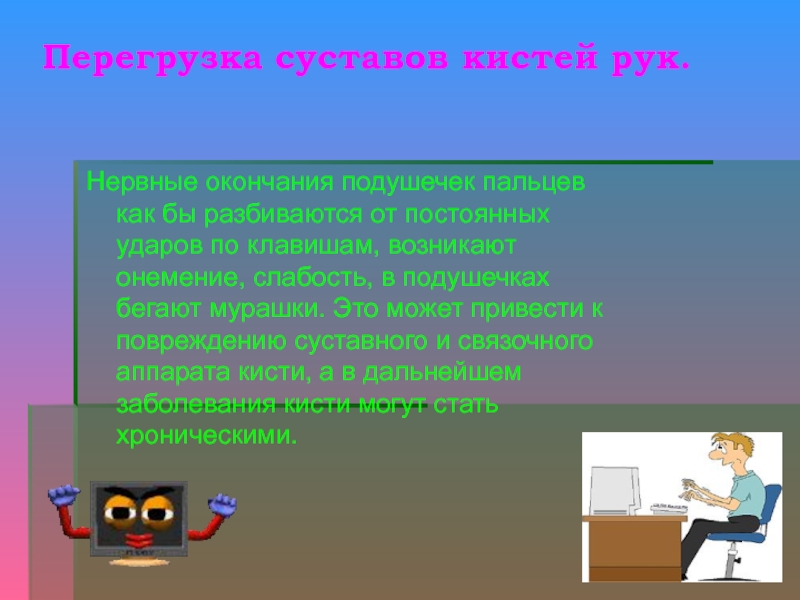 постоянных ударов по клавишам, возникают онемение, слабость, в подушечках бегают мурашки. Это может привести к повреждению суставного и связочного аппарата кисти, а в дальнейшем заболевания кисти могут стать хроническими.