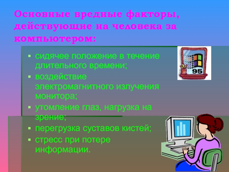 Слайд 2Основные вредные факторы, действующие на человека за компьютером: