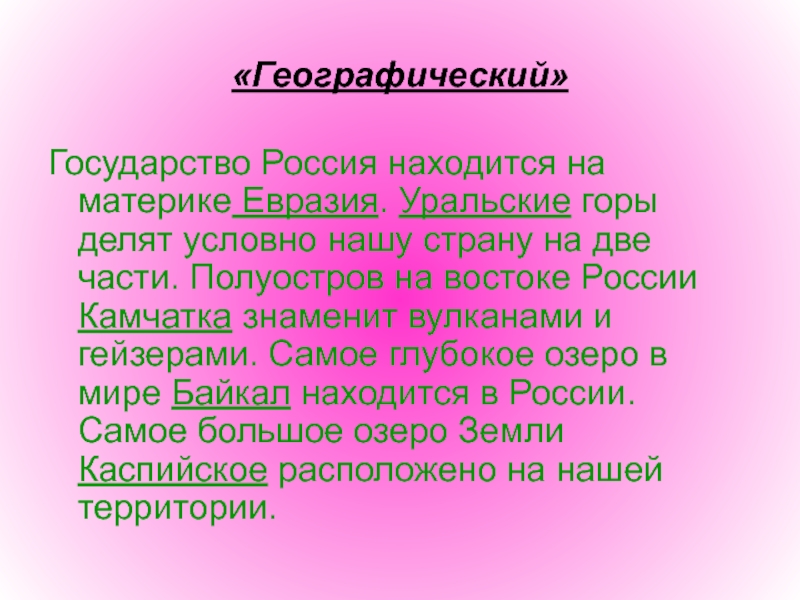 страну на две части. Полуостров на востоке России Камчатка знаменит вулканами и гейзерами. Самое глубокое озеро в мире Байкал находится в России. Самое большое озеро Земли Каспийское расположено на нашей территории.