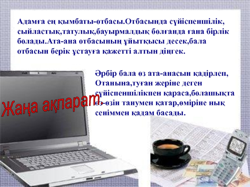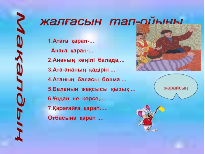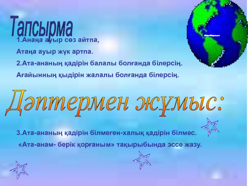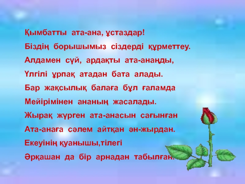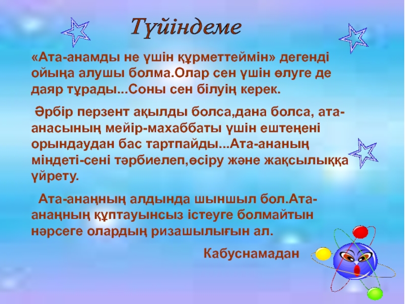 Кейбір тәрбиесіз, арсыз балалар ата-анасына қарсы сөйлеп, тыңдамай жатады. Ондай Қылықтардан аулақ болып ана,әке,апа,қарындас туыстарыңды сыйлап жүріңдер.Әке-тірегің,қамқоршың, асқар тауың.Ана- жарық дүниеге әкелуші.