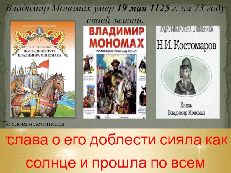 Владимир Мономах умер 19 мая 1125 г. на 73 году своей жизни.