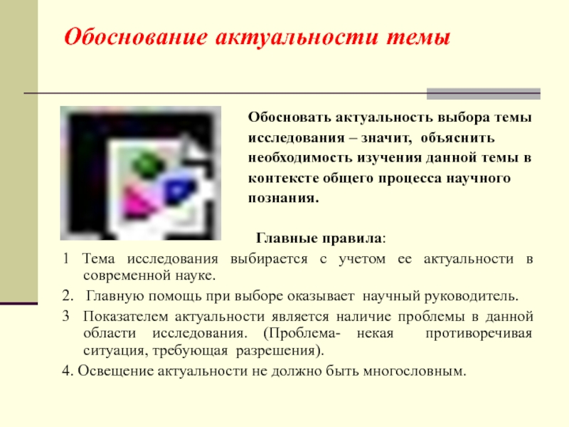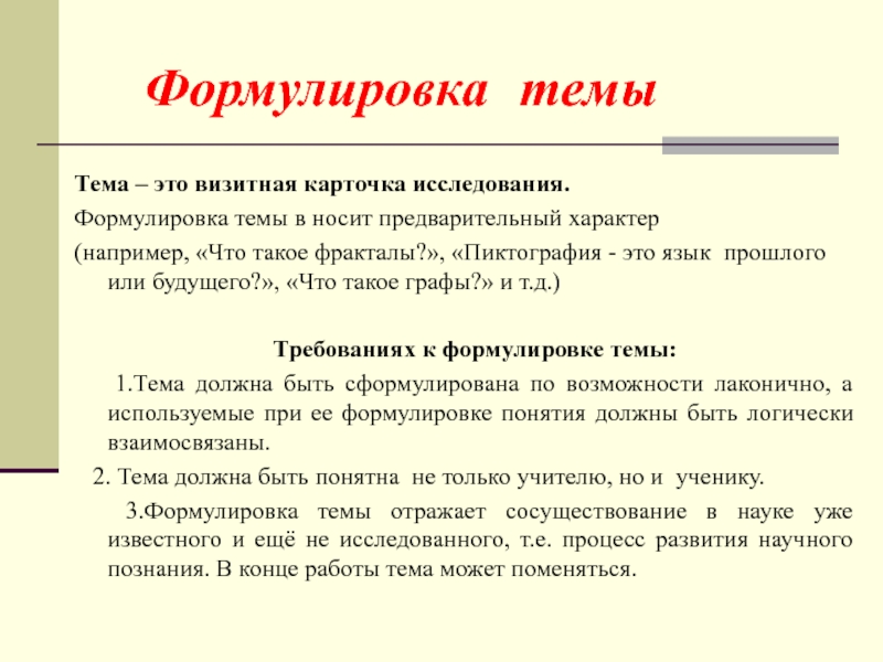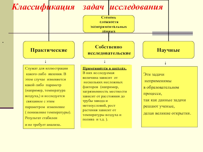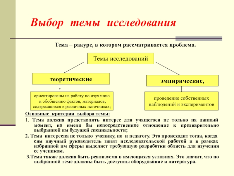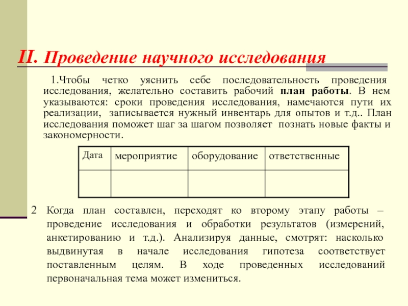 Когда план составлен, переходят ко второму этапу работы – проведение исследования и обработки результатов (измерений, анкетированию и т.д.). Анализируя данные, смотрят: насколько выдвинутая в начале исследования гипотеза соответствует поставленным целям. В ходе проведенных исследований первоначальная тема может измениться.