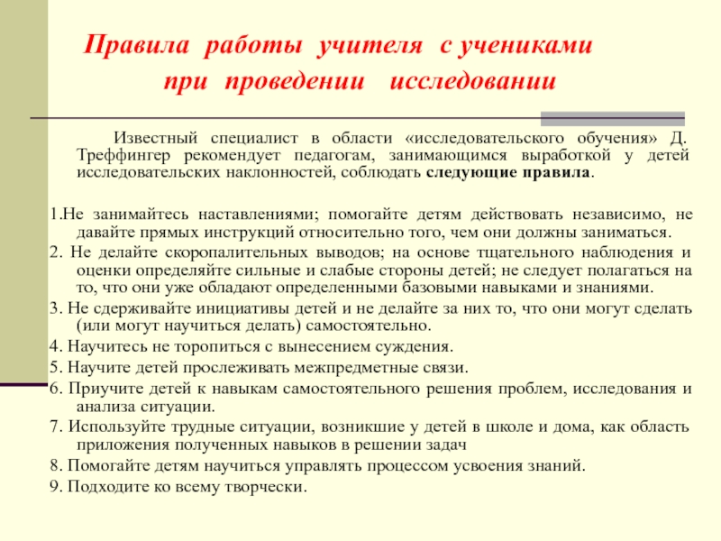 Известный специалист в области «исследовательского обучения» Д. Треффингер рекомендует педагогам, занимающимся выработкой у детей исследовательских наклонностей, соблюдать следующие правила.