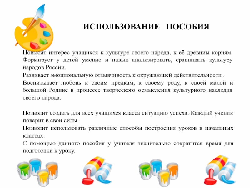 Повысит интерес учащихся к культуре своего народа, к её древним корням. Формирует у детей умение и навык анализировать, сравнивать культуру народов России.