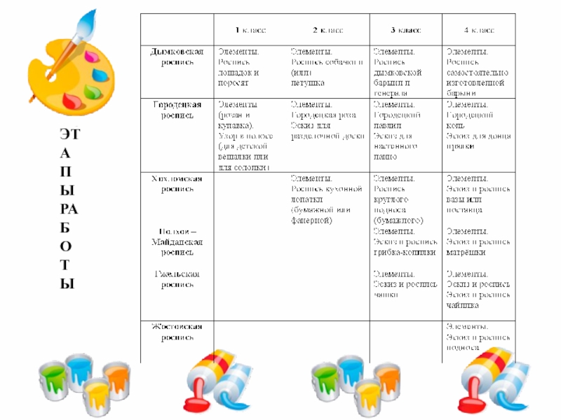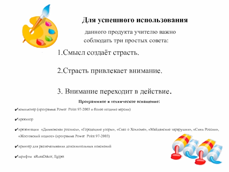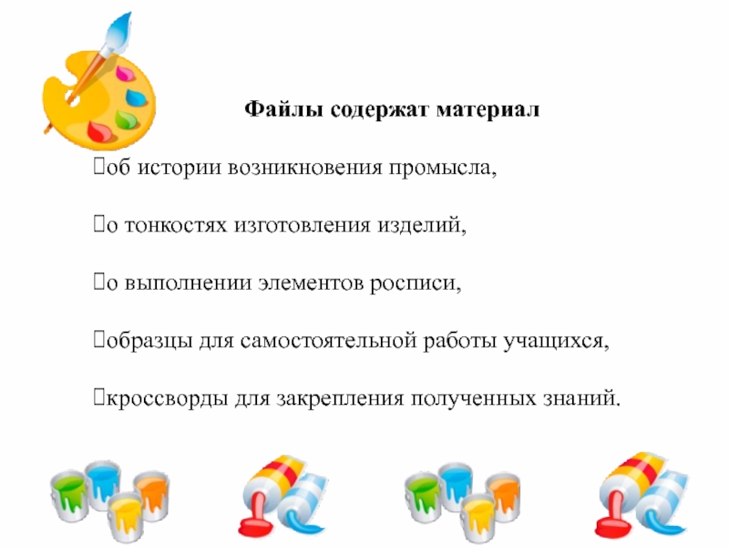 презентации «Дымковская роспись», «Городецкие узоры», «Сказ о Хохломе», «Майданские тарарушки», «Синь России», «Жостовский поднос» (программа Power Point 97-2003)