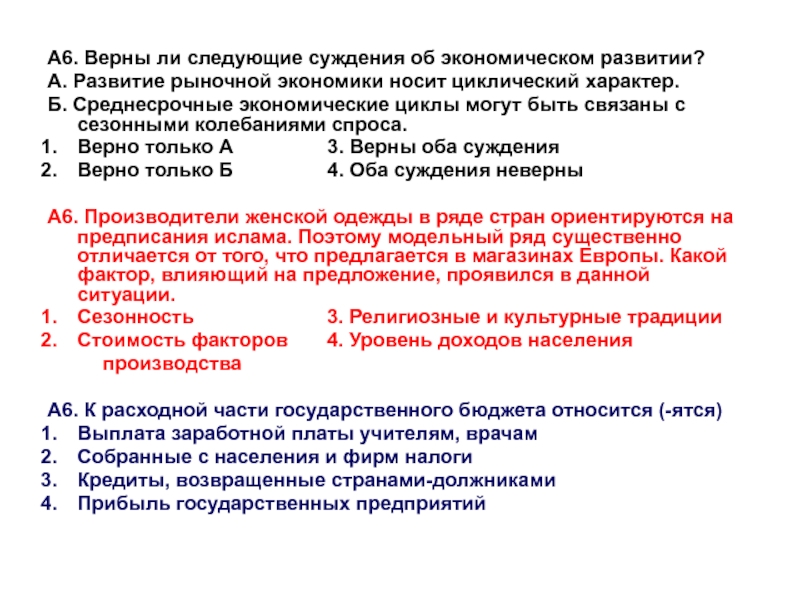 А6. Производители женской одежды в ряде стран ориентируются на предписания ислама. Поэтому модельный ряд существенно отличается от того, что предлагается в магазинах Европы. Какой фактор, влияющий на предложение, проявился в данной ситуации.