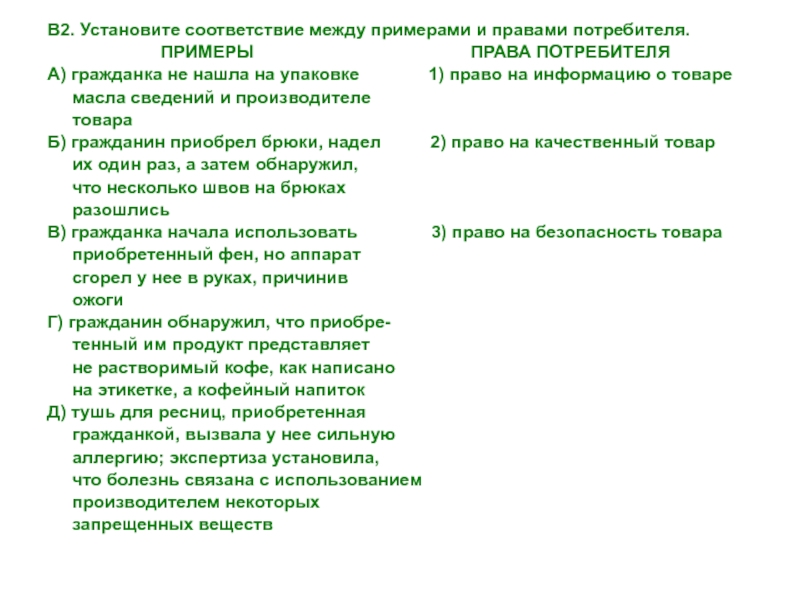 Слайд 14В2. Установите соответствие между примерами и правами потребителя.
