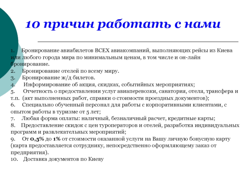 6.    Специально обученный персонал для работы с корпоративными клиентами, с опытом работы в туризме от 5 лет;
