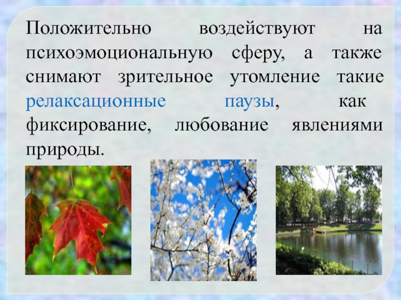 Слайд 18Положительно воздействуют на психоэмоциональную сферу, а также снимают зрительное утомление такие