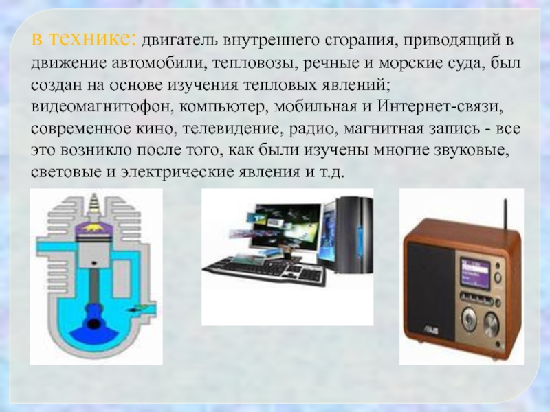 и морские суда, был создан на основе изучения тепловых явлений; видеомагнитофон, компьютер, мобильная и Интернет-связи, современное кино, телевидение, радио, магнитная запись - все это возникло после того, как были изучены многие звуковые, световые и электрические явления и т.д.