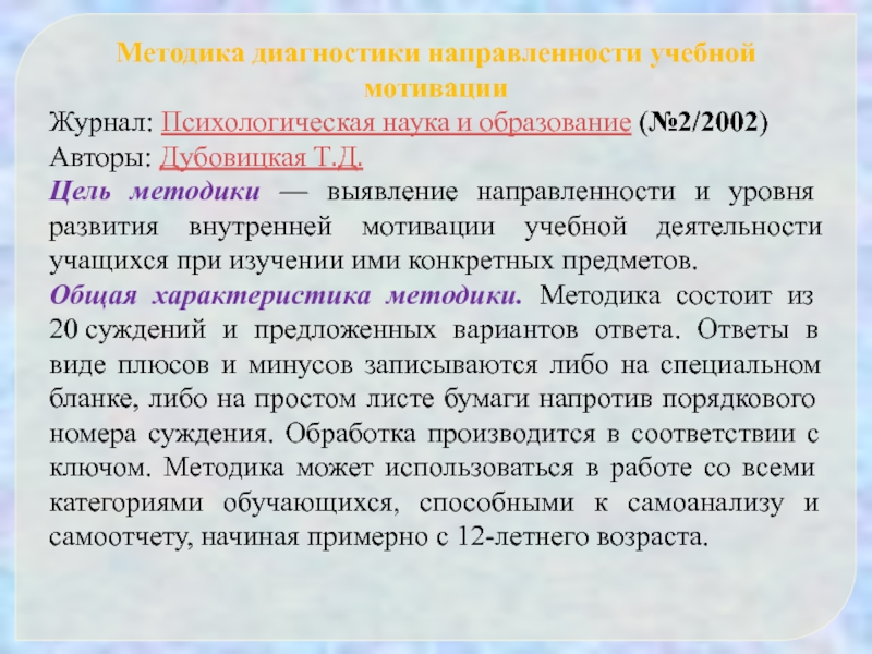 Общая характеристика методики. Методика состоит из 20 суждений и предложенных вариантов ответа. Ответы в виде плюсов и минусов записываются либо на специальном бланке, либо на простом листе бумаги напротив порядкового номера суждения. Обработка производится в соответствии с ключом. Методика может использоваться в работе со всеми категориями обучающихся, способными к самоанализу и самоотчету, начиная примерно с 12-летнего возраста.