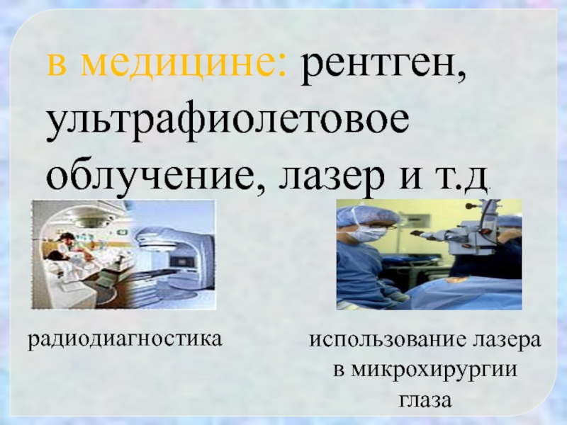 Слайд 9в медицине: рентген, ультрафиолетовое облучение, лазер и т.д.