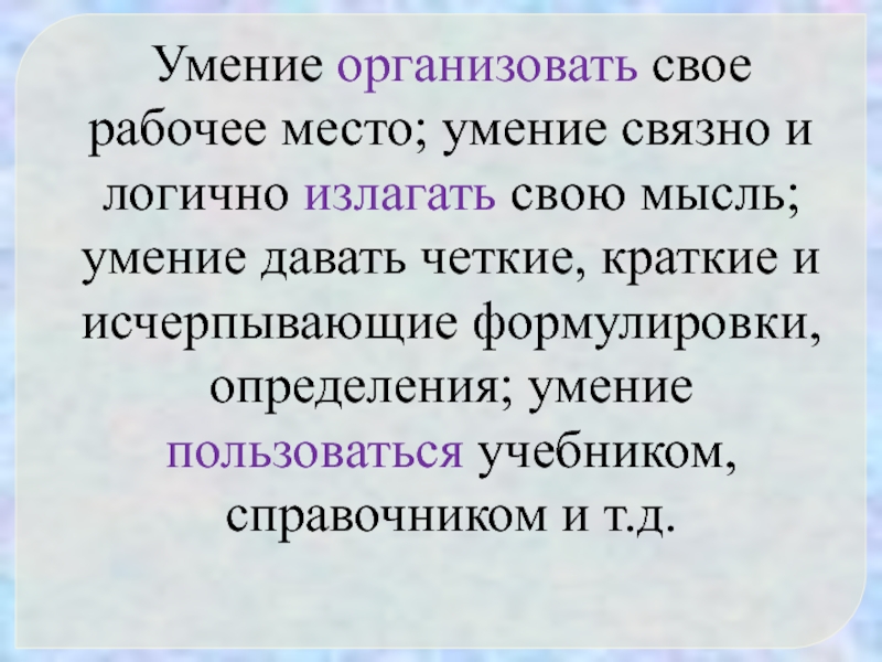 мысль; умение давать четкие, краткие и исчерпывающие формулировки, определения; умение пользоваться учебником, справочником и т.д.