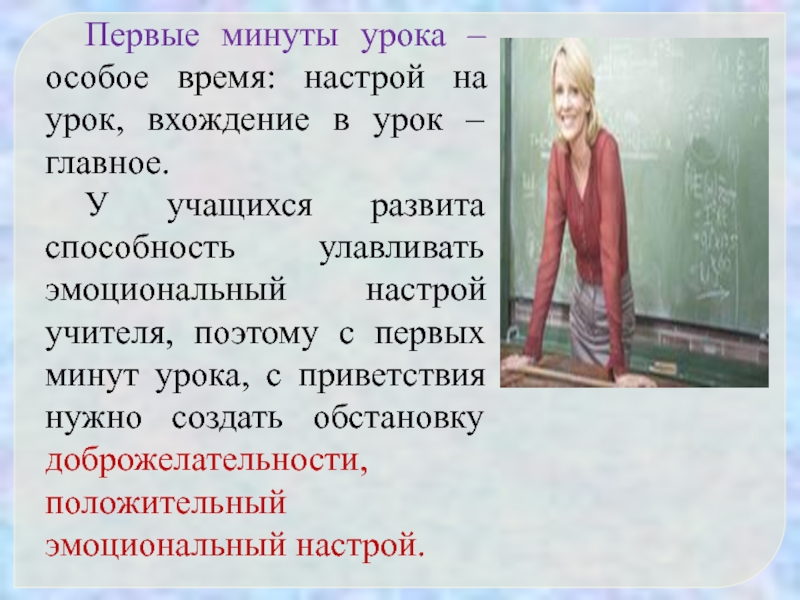 У учащихся развита способность улавливать эмоциональный настрой учителя, поэтому с первых минут урока, с приветствия нужно создать обстановку доброжелательности, положительный эмоциональный настрой.