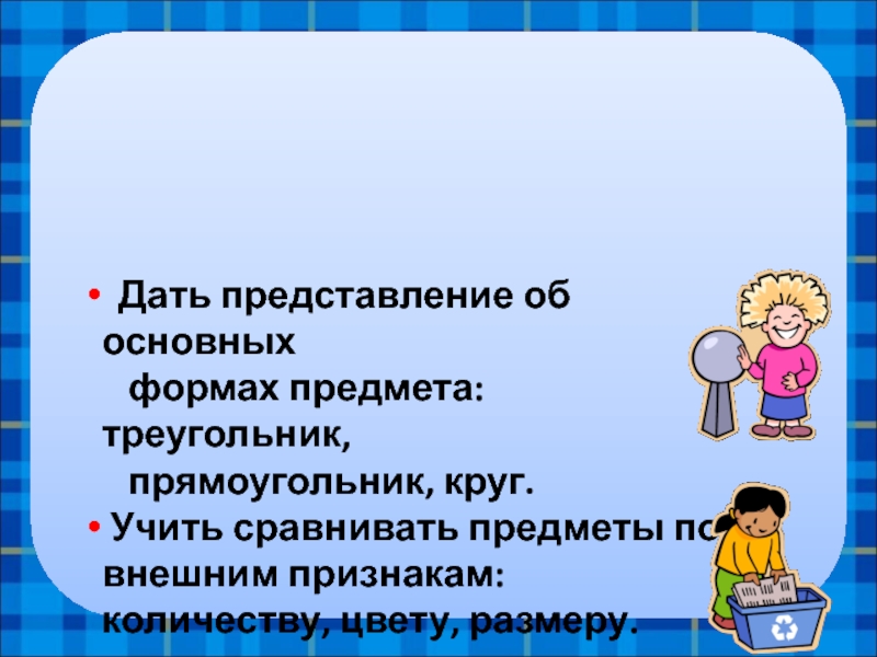 Учить сравнивать предметы по внешним признакам: количеству, цвету, размеру.