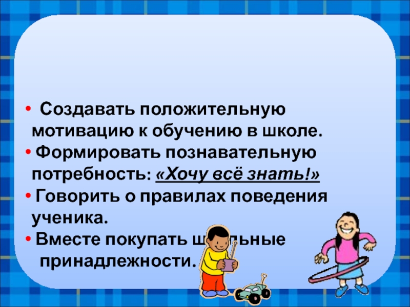 Создавать положительную мотивацию к обучению в школе.