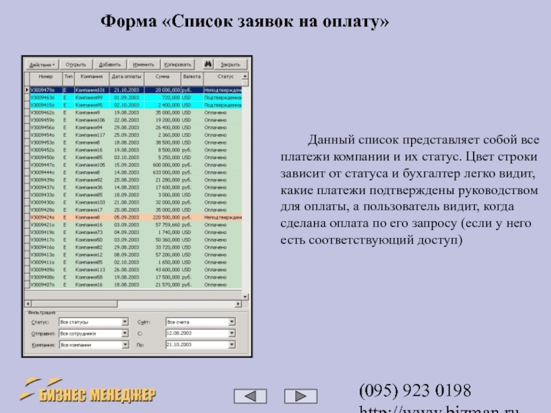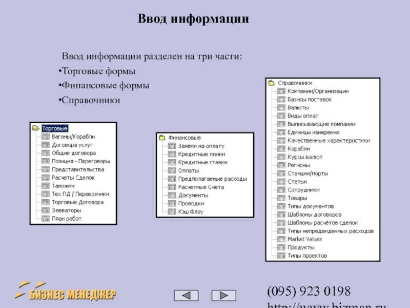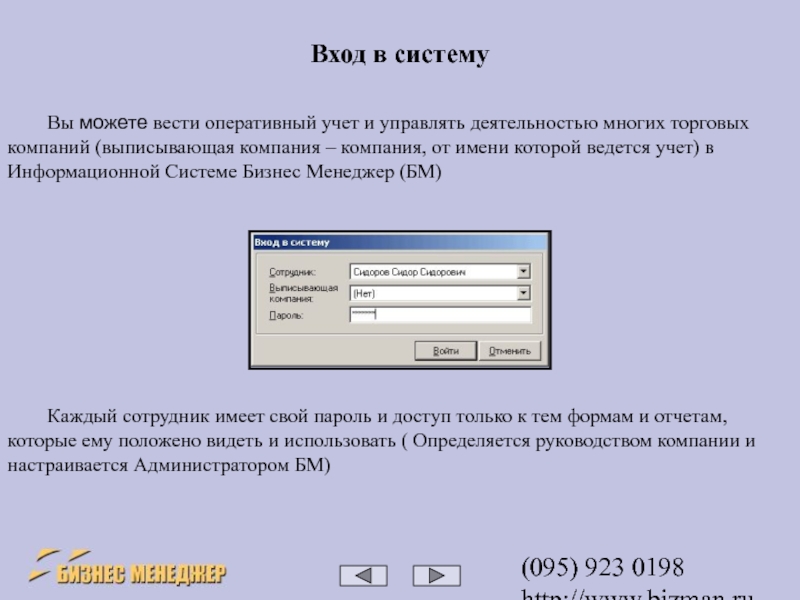 Каждый сотрудник имеет свой пароль и доступ только к тем формам и отчетам, которые ему положено видеть и использовать ( Определяется руководством компании и настраивается Администратором БМ)