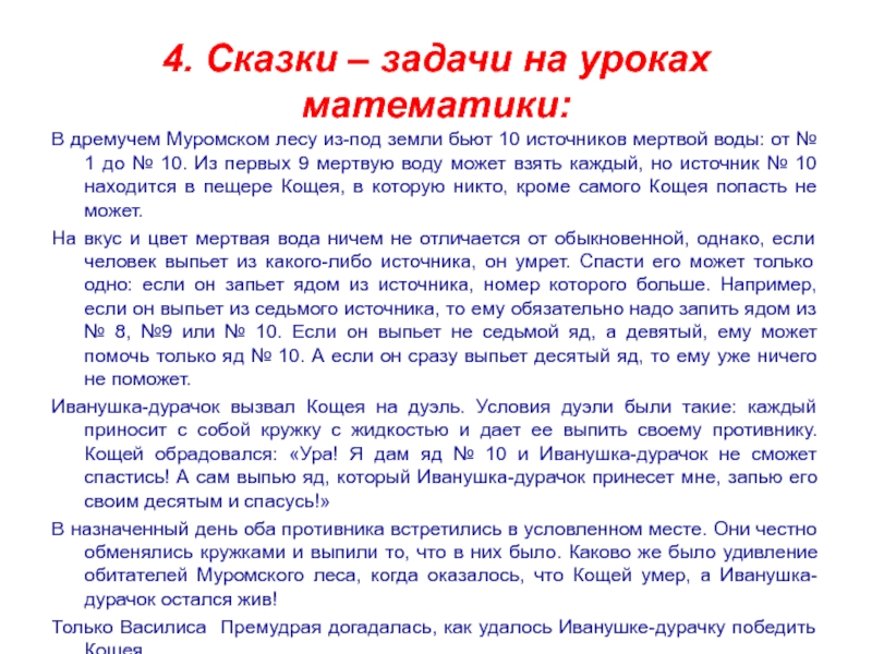 Только Василиса Премудрая догадалась, как удалось Иванушке-дурачку победить Кощея.