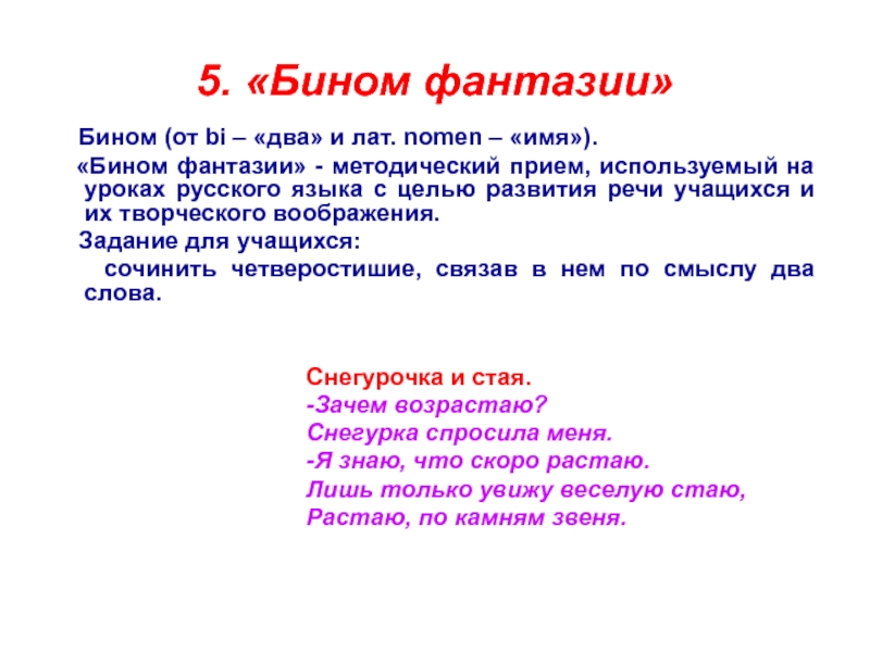 «Бином фантазии» - методический прием, используемый на уроках русского языка с целью развития речи учащихся и их творческого воображения.