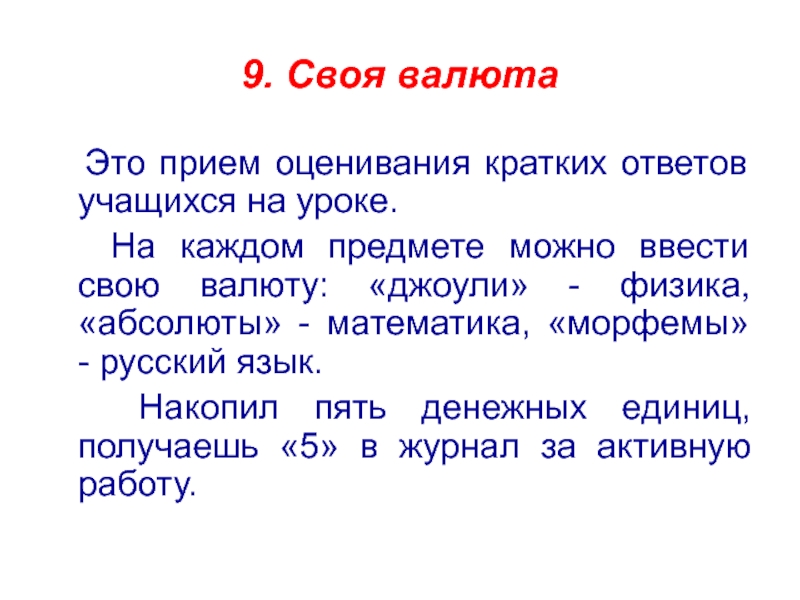 На каждом предмете можно ввести свою валюту: «джоули» - физика, «абсолюты» - математика, «морфемы» - русский язык.