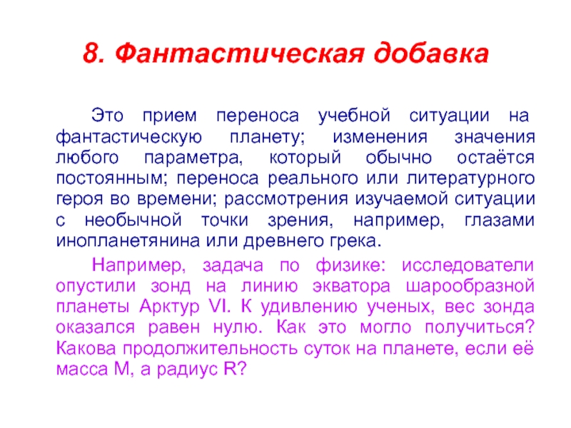 Например, задача по физике: исследователи опустили зонд на линию экватора шарообразной планеты Арктур VI. К удивлению ученых, вес зонда оказался равен нулю. Как это могло получиться? Какова продолжительность суток на планете, если её масса М, а радиус R?