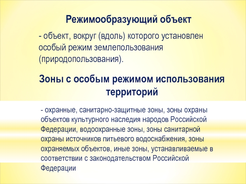 - охранные, санитарно-защитные зоны, зоны охраны объектов культурного наследия народов Российской Федерации, водоохранные зоны, зоны санитарной охраны источников питьевого водоснабжения, зоны охраняемых объектов, иные зоны, устанавливаемые в соответствии с законодательством Российской Федерации
