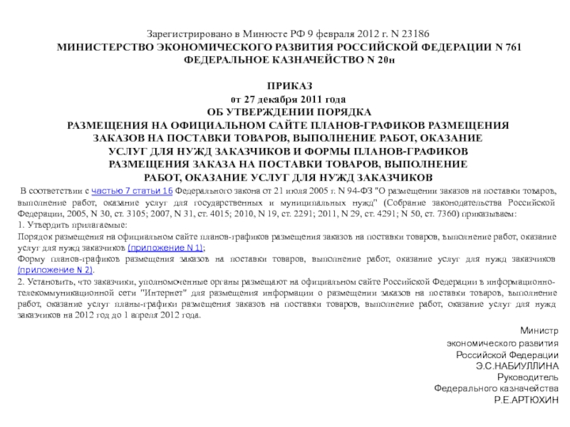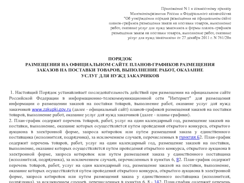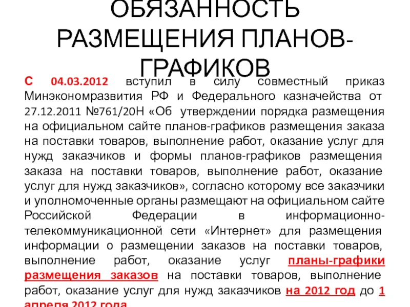 и Федерального казначейства от 27.12.2011 №761/20Н «Об утверждении порядка размещения на официальном сайте планов-графиков размещения заказа на поставки товаров, выполнение работ, оказание услуг для нужд заказчиков и формы планов-графиков размещения заказа на поставки товаров, выполнение работ, оказание услуг для нужд заказчиков», согласно которому все заказчики и уполномоченные органы размещают на официальном сайте Российской Федерации в информационно-телекоммуникационной сети «Интернет» для размещения информации о размещении заказов на поставки товаров, выполнение работ, оказание услуг планы-графики размещения заказов на поставки товаров, выполнение работ, оказание услуг для нужд заказчиков на 2012 год до 1 апреля 2012 года.