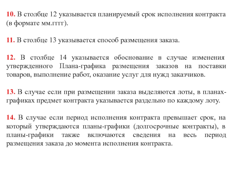 Слайд 1310. В столбце 12 указывается планируемый срок исполнения контракта (в формате