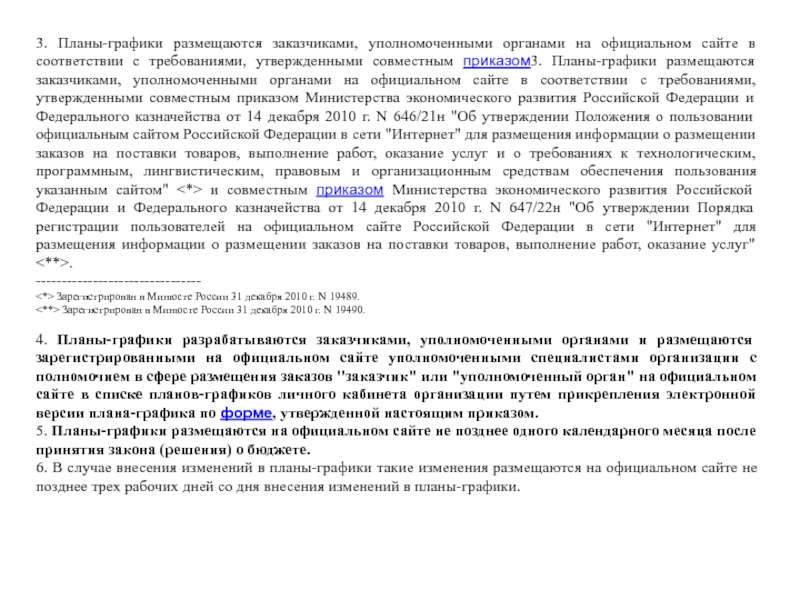 с требованиями, утвержденными совместным приказом3. Планы-графики размещаются заказчиками, уполномоченными органами на официальном сайте в соответствии с требованиями, утвержденными совместным приказом Министерства экономического развития Российской Федерации и Федерального казначейства от 14 декабря 2010 г. N 646/21н "Об утверждении Положения о пользовании официальным сайтом Российской Федерации в сети "Интернет" для размещения информации о размещении заказов на поставки товаров, выполнение работ, оказание услуг и о требованиях к технологическим, программным, лингвистическим, правовым и организационным средствам обеспечения пользования указанным сайтом" <*> и совместным приказом Министерства экономического развития Российской Федерации и Федерального казначейства от 14 декабря 2010 г. N 647/22н "Об утверждении Порядка регистрации пользователей на официальном сайте Российской Федерации в сети "Интернет" для размещения информации о размещении заказов на поставки товаров, выполнение работ, оказание услуг" <**>.