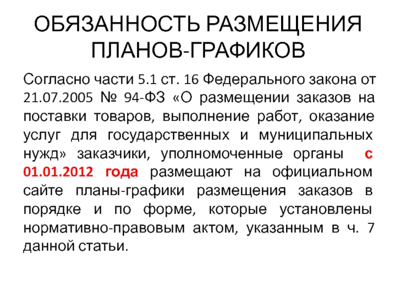 № 94-ФЗ «О размещении заказов на поставки товаров, выполнение работ, оказание услуг для государственных и муниципальных нужд» заказчики, уполномоченные органы с 01.01.2012 года размещают на официальном сайте планы-графики размещения заказов в порядке и по форме, которые установлены нормативно-правовым актом, указанным в ч. 7 данной статьи.