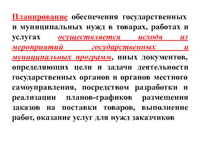 осуществляется исходя из мероприятий государственных и муниципальных программ, иных документов, определяющих цели и задачи деятельности государственных органов и органов местного самоуправления, посредством разработки и реализации планов-графиков размещения заказов на поставки товаров, выполнение работ, оказание услуг для нужд заказчиков