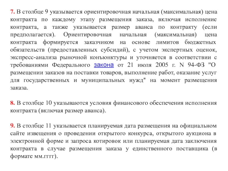 Слайд 127. В столбце 9 указывается ориентировочная начальная (максимальная) цена контракта по