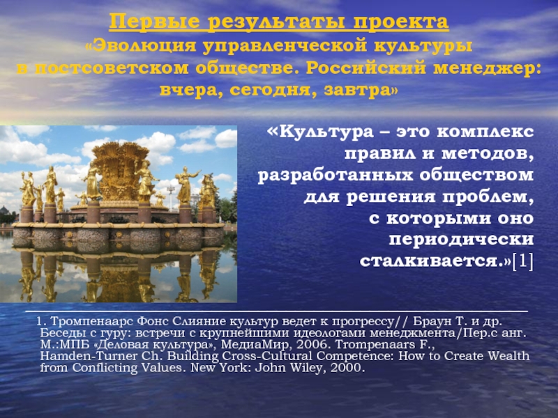 1. Тромпенаарс Фонс Слияние культур ведет к прогрессу// Браун Т. и др. Беседы с гуру: встречи с крупнейшими идеологами менеджмента/Пер.с анг. М.:МПБ «Деловая культура», МедиаМир, 2006. Trompenaars F., Hamden-Turner Ch. Building Cross-Cultural Competence: How to Create Wealth from Conflicting Values. New York: John Wiley, 2000.
