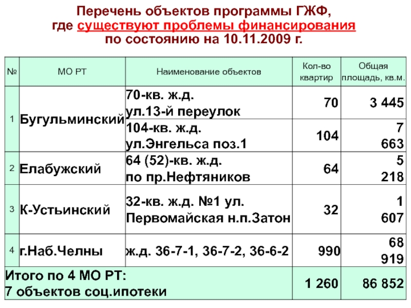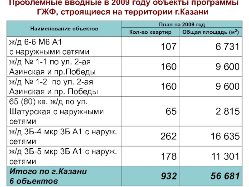 Слайд 17Проблемные вводные в 2009 году объекты программы ГЖФ, строящиеся на территории
