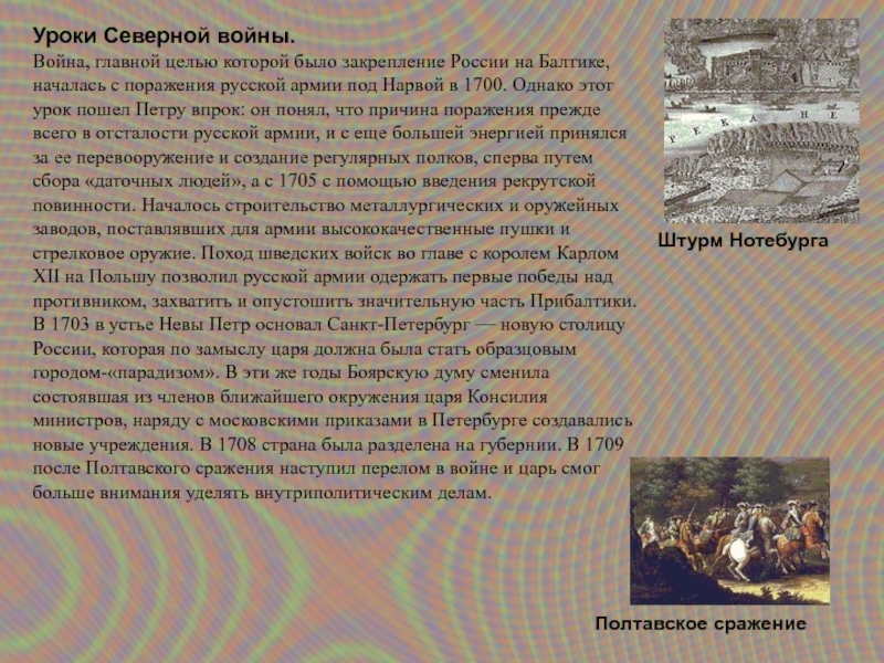 Война, главной целью которой было закрепление России на Балтике, началась с поражения русской армии под Нарвой в 1700. Однако этот урок пошел Петру впрок: он понял, что причина поражения прежде всего в отсталости русской армии, и с еще большей энергией принялся за ее перевооружение и создание регулярных полков, сперва путем сбора «даточных людей», а с 1705 с помощью введения рекрутской повинности. Началось строительство металлургических и оружейных заводов, поставлявших для армии высококачественные пушки и стрелковое оружие. Поход шведских войск во главе с королем Карлом XII на Польшу позволил русской армии одержать первые победы над противником, захватить и опустошить значительную часть Прибалтики. В 1703 в устье Невы Петр основал Санкт-Петербург — новую столицу России, которая по замыслу царя должна была стать образцовым городом-«парадизом». В эти же годы Боярскую думу сменила состоявшая из членов ближайшего окружения царя Консилия министров, наряду с московскими приказами в Петербурге создавались новые учреждения. В 1708 страна была разделена на губернии. В 1709 после Полтавского сражения наступил перелом в войне и царь смог больше внимания уделять внутриполитическим делам.
