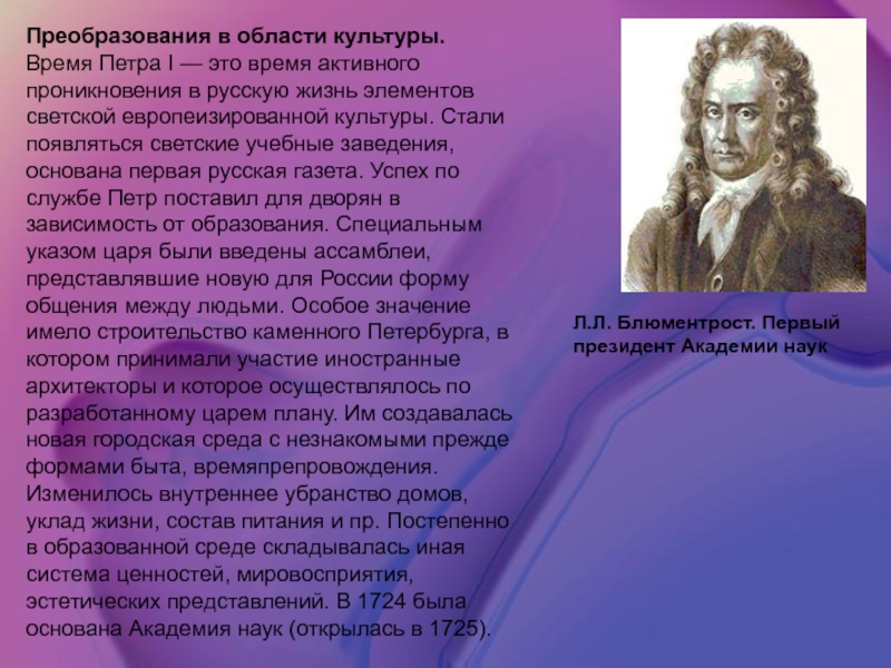 Время Петра I — это время активного проникновения в русскую жизнь элементов светской европеизированной культуры. Стали появляться светские учебные заведения, основана первая русская газета. Успех по службе Петр поставил для дворян в зависимость от образования. Специальным указом царя были введены ассамблеи, представлявшие новую для России форму общения между людьми. Особое значение имело строительство каменного Петербурга, в котором принимали участие иностранные архитекторы и которое осуществлялось по разработанному царем плану. Им создавалась новая городская среда с незнакомыми прежде формами быта, времяпрепровождения. Изменилось внутреннее убранство домов, уклад жизни, состав питания и пр. Постепенно в образованной среде складывалась иная система ценностей, мировосприятия, эстетических представлений. В 1724 была основана Академия наук (открылась в 1725).