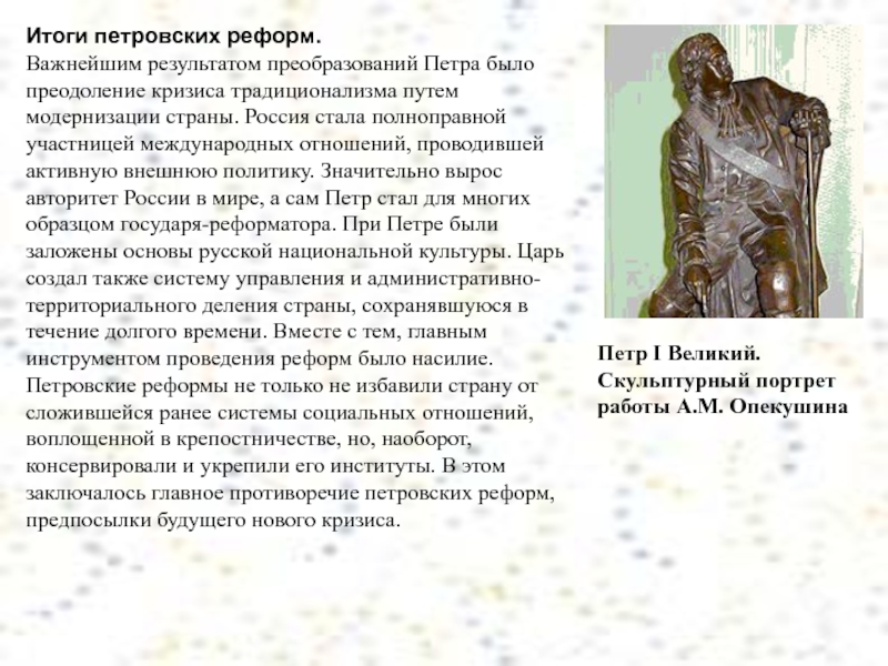 Важнейшим результатом преобразований Петра было преодоление кризиса традиционализма путем модернизации страны. Россия стала полноправной участницей международных отношений, проводившей активную внешнюю политику. Значительно вырос авторитет России в мире, а сам Петр стал для многих образцом государя-реформатора. При Петре были заложены основы русской национальной культуры. Царь создал также систему управления и административно-территориального деления страны, сохранявшуюся в течение долгого времени. Вместе с тем, главным инструментом проведения реформ было насилие. Петровские реформы не только не избавили страну от сложившейся ранее системы социальных отношений, воплощенной в крепостничестве, но, наоборот, консервировали и укрепили его институты. В этом заключалось главное противоречие петровских реформ, предпосылки будущего нового кризиса.