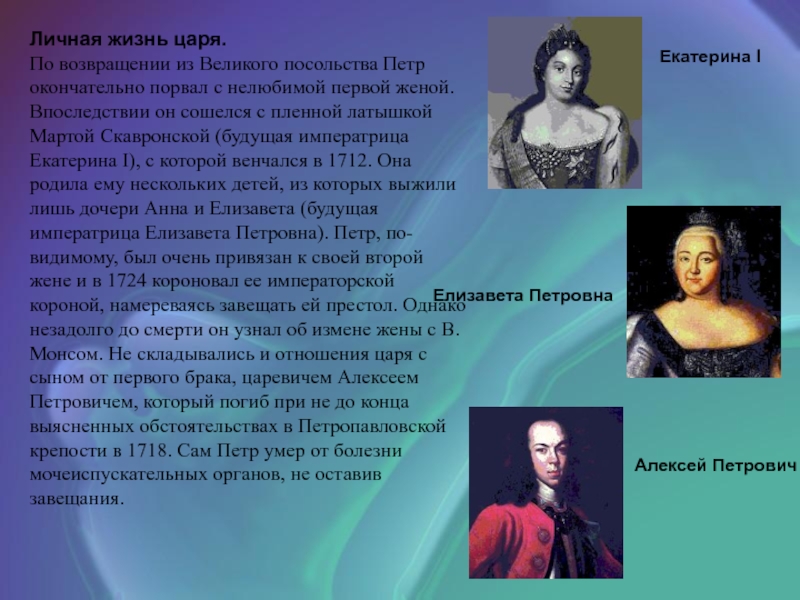 По возвращении из Великого посольства Петр окончательно порвал с нелюбимой первой женой. Впоследствии он сошелся с пленной латышкой Мартой Скавронской (будущая императрица Екатерина I), с которой венчался в 1712. Она родила ему нескольких детей, из которых выжили лишь дочери Анна и Елизавета (будущая императрица Елизавета Петровна). Петр, по-видимому, был очень привязан к своей второй жене и в 1724 короновал ее императорской короной, намереваясь завещать ей престол. Однако незадолго до смерти он узнал об измене жены с В. Монсом. Не складывались и отношения царя с сыном от первого брака, царевичем Алексеем Петровичем, который погиб при не до конца выясненных обстоятельствах в Петропавловской крепости в 1718. Сам Петр умер от болезни мочеиспускательных органов, не оставив завещания.