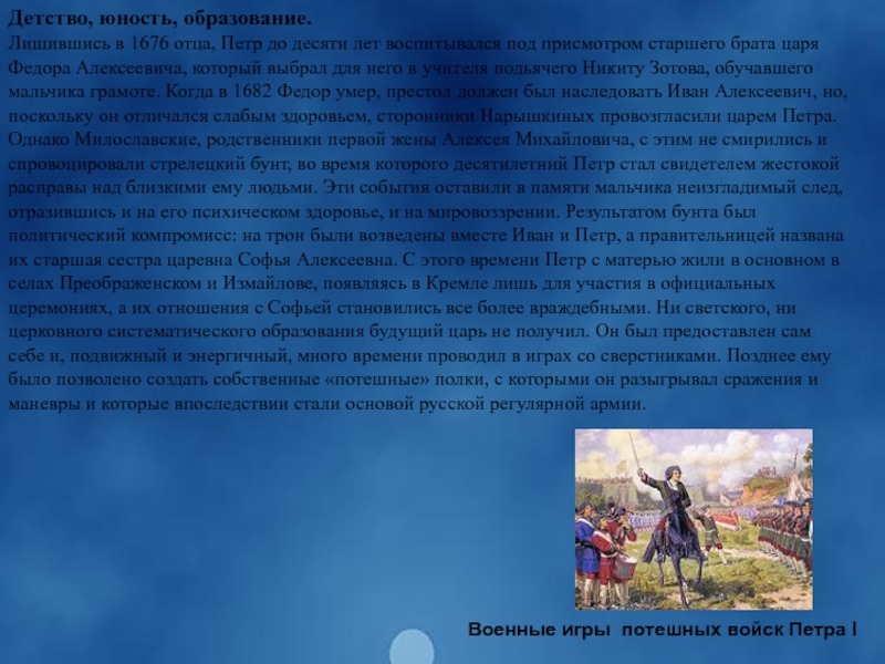 Лишившись в 1676 отца, Петр до десяти лет воспитывался под присмотром старшего брата царя Федора Алексеевича, который выбрал для него в учителя подьячего Никиту Зотова, обучавшего мальчика грамоте. Когда в 1682 Федор умер, престол должен был наследовать Иван Алексеевич, но, поскольку он отличался слабым здоровьем, сторонники Нарышкиных провозгласили царем Петра. Однако Милославские, родственники первой жены Алексея Михайловича, с этим не смирились и спровоцировали стрелецкий бунт, во время которого десятилетний Петр стал свидетелем жестокой расправы над близкими ему людьми. Эти события оставили в памяти мальчика неизгладимый след, отразившись и на его психическом здоровье, и на мировоззрении. Результатом бунта был политический компромисс: на трон были возведены вместе Иван и Петр, а правительницей названа их старшая сестра царевна Софья Алексеевна. С этого времени Петр с матерью жили в основном в селах Преображенском и Измайлове, появляясь в Кремле лишь для участия в официальных церемониях, а их отношения с Софьей становились все более враждебными. Ни светского, ни церковного систематического образования будущий царь не получил. Он был предоставлен сам себе и, подвижный и энергичный, много времени проводил в играх со сверстниками. Позднее ему было позволено создать собственные «потешные» полки, с которыми он разыгрывал сражения и маневры и которые впоследствии стали основой русской регулярной армии.