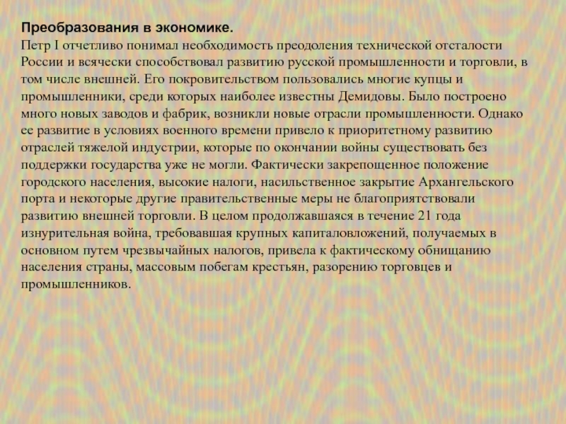 Петр I отчетливо понимал необходимость преодоления технической отсталости России и всячески способствовал развитию русской промышленности и торговли, в том числе внешней. Его покровительством пользовались многие купцы и промышленники, среди которых наиболее известны Демидовы. Было построено много новых заводов и фабрик, возникли новые отрасли промышленности. Однако ее развитие в условиях военного времени привело к приоритетному развитию отраслей тяжелой индустрии, которые по окончании войны существовать без поддержки государства уже не могли. Фактически закрепощенное положение городского населения, высокие налоги, насильственное закрытие Архангельского порта и некоторые другие правительственные меры не благоприятствовали развитию внешней торговли. В целом продолжавшаяся в течение 21 года изнурительная война, требовавшая крупных капиталовложений, получаемых в основном путем чрезвычайных налогов, привела к фактическому обнищанию населения страны, массовым побегам крестьян, разорению торговцев и промышленников.