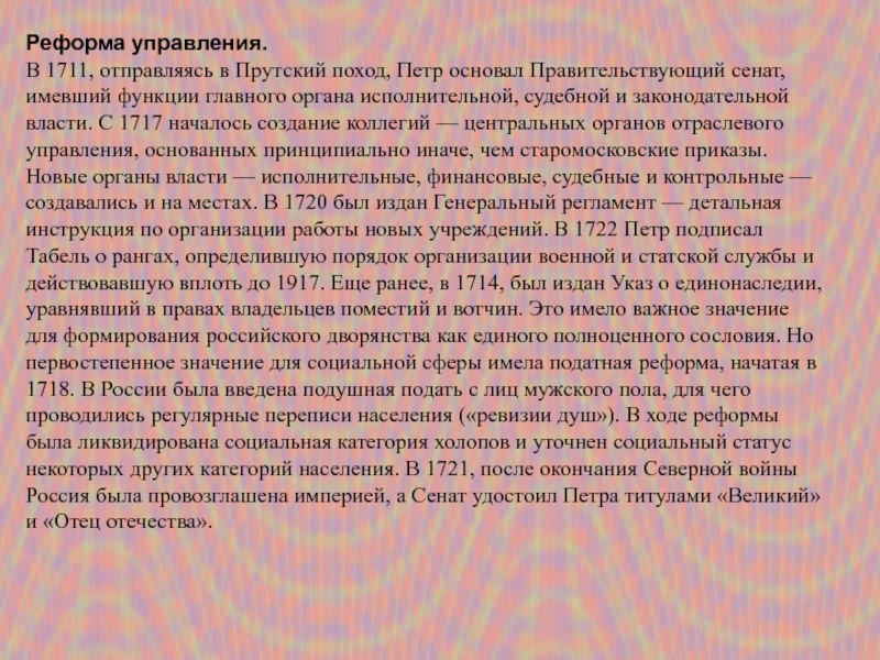 В 1711, отправляясь в Прутский поход, Петр основал Правительствующий сенат, имевший функции главного органа исполнительной, судебной и законодательной власти. С 1717 началось создание коллегий — центральных органов отраслевого управления, основанных принципиально иначе, чем старомосковские приказы. Новые органы власти — исполнительные, финансовые, судебные и контрольные — создавались и на местах. В 1720 был издан Генеральный регламент — детальная инструкция по организации работы новых учреждений. В 1722 Петр подписал Табель о рангах, определившую порядок организации военной и статской службы и действовавшую вплоть до 1917. Еще ранее, в 1714, был издан Указ о единонаследии, уравнявший в правах владельцев поместий и вотчин. Это имело важное значение для формирования российского дворянства как единого полноценного сословия. Но первостепенное значение для социальной сферы имела податная реформа, начатая в 1718. В России была введена подушная подать с лиц мужского пола, для чего проводились регулярные переписи населения («ревизии душ»). В ходе реформы была ликвидирована социальная категория холопов и уточнен социальный статус некоторых других категорий населения. В 1721, после окончания Северной войны Россия была провозглашена империей, а Сенат удостоил Петра титулами «Великий» и «Отец отечества».